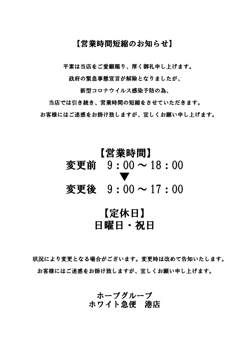 営業時間短縮のお知らせ港店